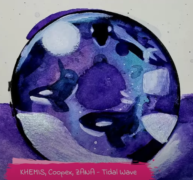 So this piece is of three orcas in a galaxy/nebula, which is inside of a marble or eye. I’m not sure if most people notice the pupil behind them, but they are meant to be viewed emerging from the pupil.